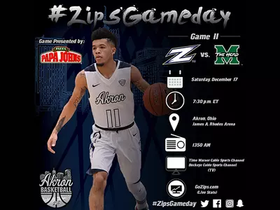 Akron Zips look for their 23rd consecutive home win, hosting Marshall at 7:30 p.m. at James A. Rhodes Arena on Saturday, Dec. 17, in a men's and women's basketball double header. The women open againast Duquesne at 5 p.m. The Akron-Marshall game will be televised on Time Warner Cable's Buckeye Cable Sports Network with Keith Morehouse calling the actionand Dave Cecutti providing analysis. Fans can follow the action on GoZips.com live stats or the Akron-IMG Sports Network. The Zips' SportsRadio 1350 AM (WARF) in Akron (flagship) with Steve French calling the action and Joe Dunn providing analysis. The pregame show starts 30 minutes prior to the contest. The free audio stream is available at SportsRadio1350.com, iHeart Radio, and TuneIn.com/Akron Zips.Â