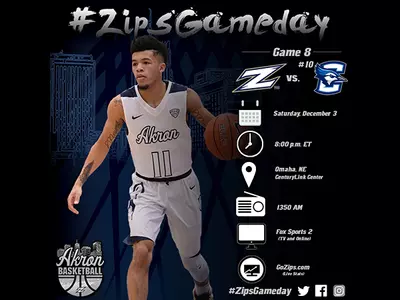Akron travels to Omaha, Neb., to battle Big East Conference member and the No. 10 ranked Creighton Bluejays on Saturday, Dec. 3, at CenturyLink Center Omaha at 8 p.m. ET. The game will be televised by FOX Sports 2 (FS2) or at FOXsportsGO.com with Steve Physioc calling the action and Nick Bahe providing analysis. Fans can also follow the action on GoZips.com via Live Stats or by Zips' radio.