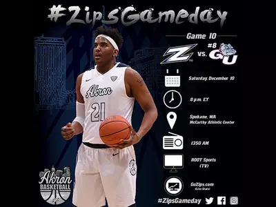 Akron travels to Spokane, Wash., to battle West Coast Conference member and the No. 8 ranked Gonzaga Bulldogs on Saturday, Dec. 10, at McCarthey Athletic Center at 8 p.m. ET. The game will be televised on ROOT Sports with Greg Heister calling the action, while Dan Dickau, and Richard Fox provide analysis. In addition, Campus Insiders will provide a free live web stream of the action, follow Campus Insiders Web Stream. Fans can also follow the action on GoZips.com via Live Stats or by Zips' radio.